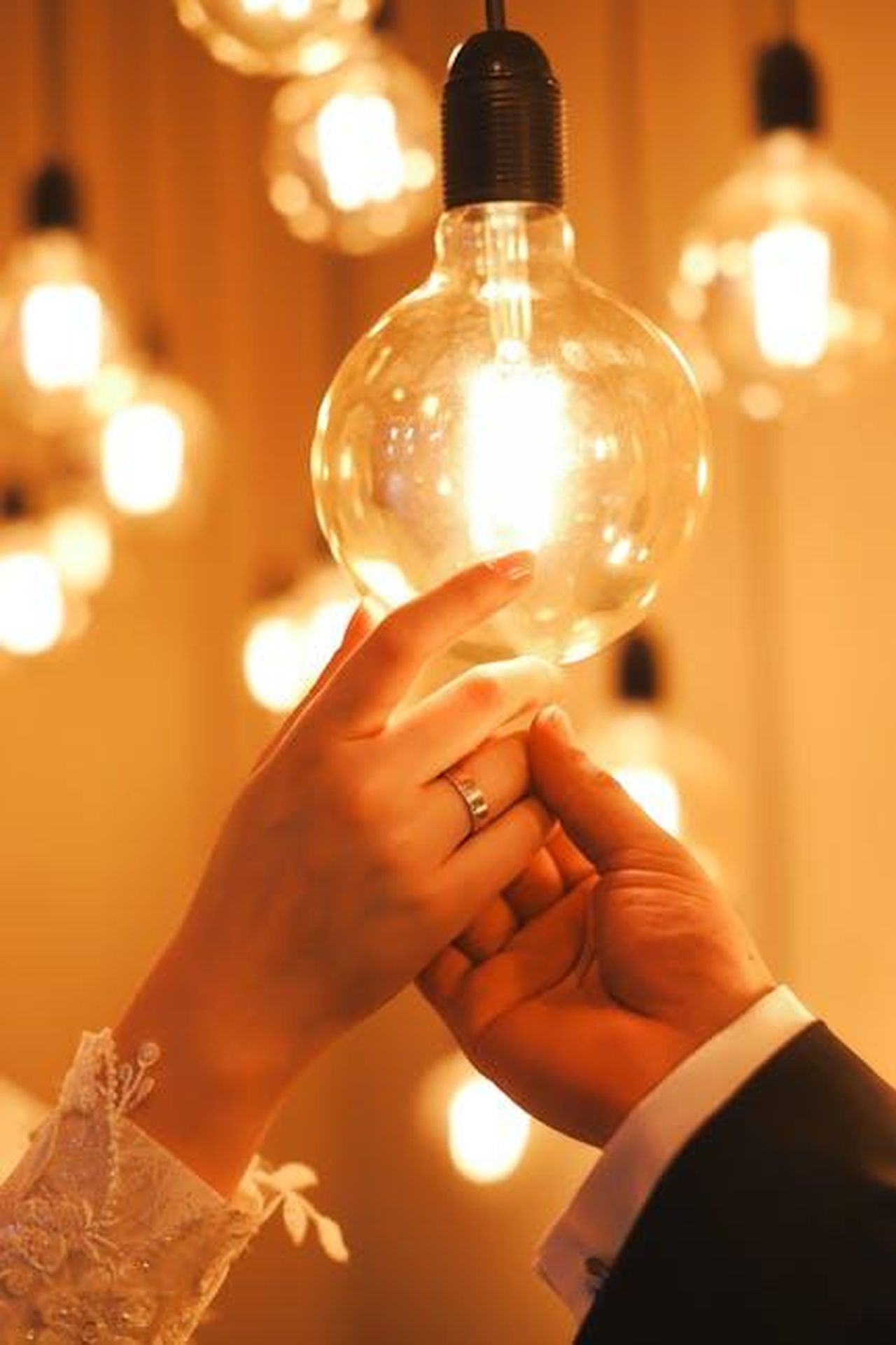 Source: Esra Kaya - pexels - A romantic moment as a couple gently hold hands beneath a glowing light bulb.