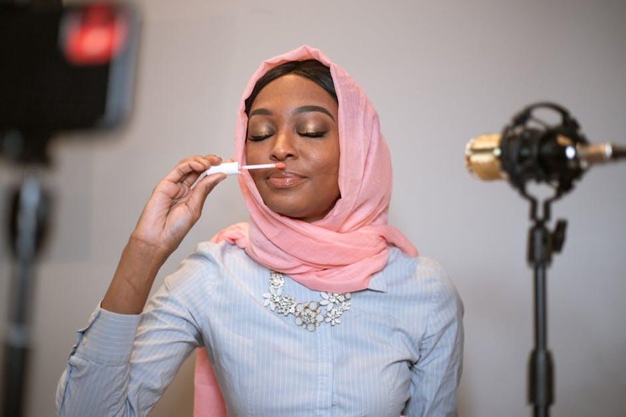 Source: RDNE Stock project – pexels – A beautiful Black Muslim woman in hijab reviews lipstick in an indoor setting for her vlog.
